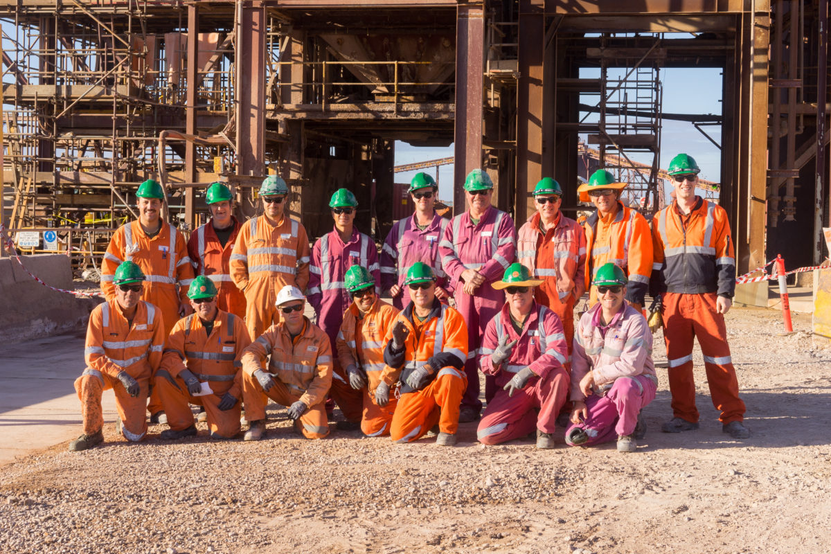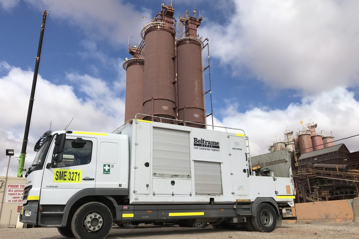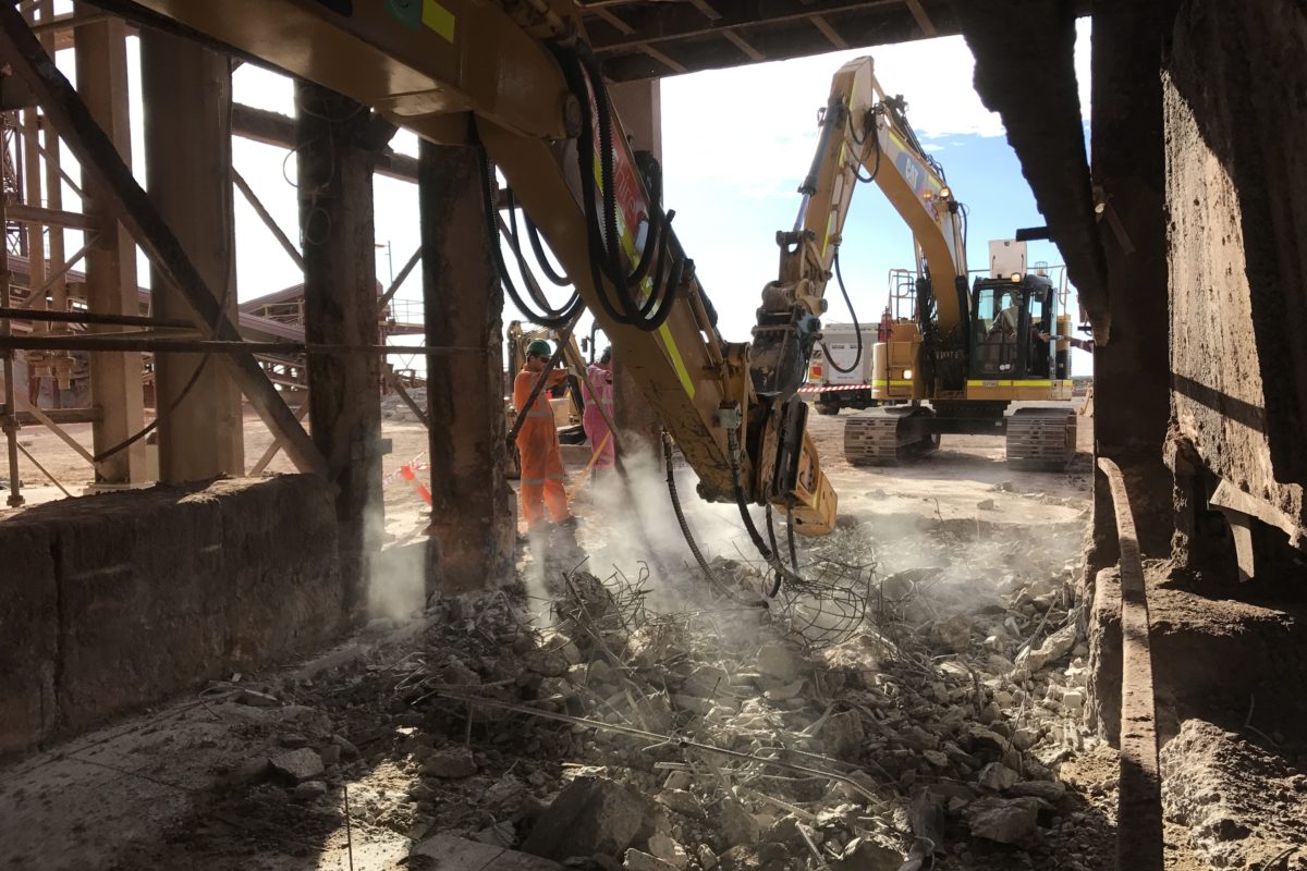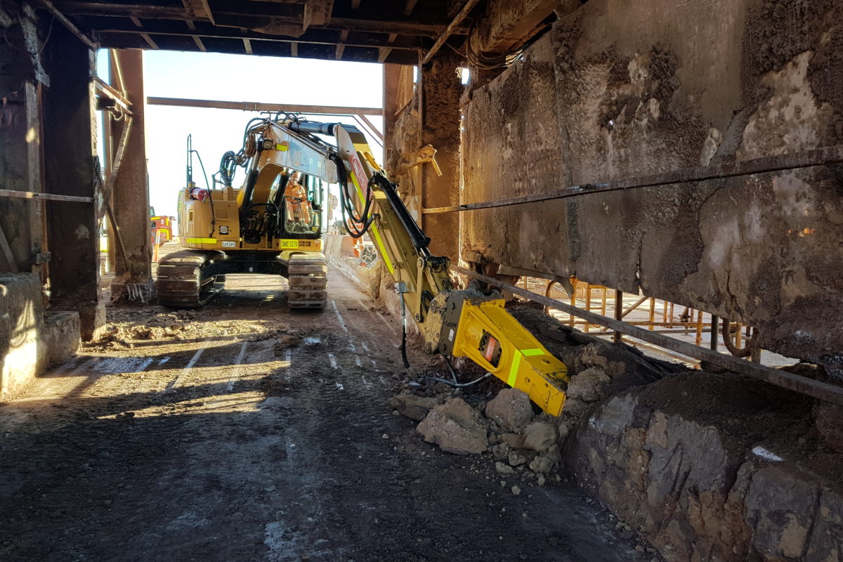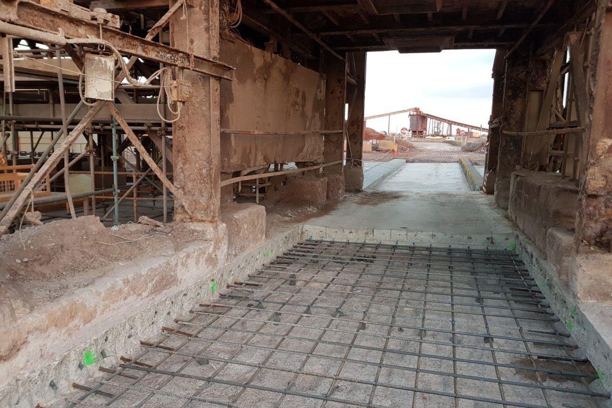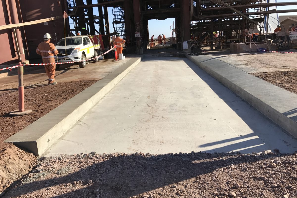 The CAF Plant at BHP OD manufactures low strength cementitious backfill materials for the reinstatement of mined stopes within the underground operation. The plant operates 24hrs, 7days a week and has a fleet of double and triple road trains which are continuously loaded by the plant. Beltrame Civil were engaged by BHP on a 17day shutdown period to demolish and reconstruct the concrete driveway pavement under the CAF plant which had become severely deteriorated by years of heavy vehicle traffic. The scope of works included cleaning the loading bay of years of built up spillage, demolition of the existing driveway pavement to 1m below the existing surface, construction of new concrete pavement in both 50Mpa and 32Mpa slabs with steel fixing and epoxy surface treatments. Installation of 18 precast concrete driveway panels, including cementitious grouting, caulking and epoxy surface coating of panels.
