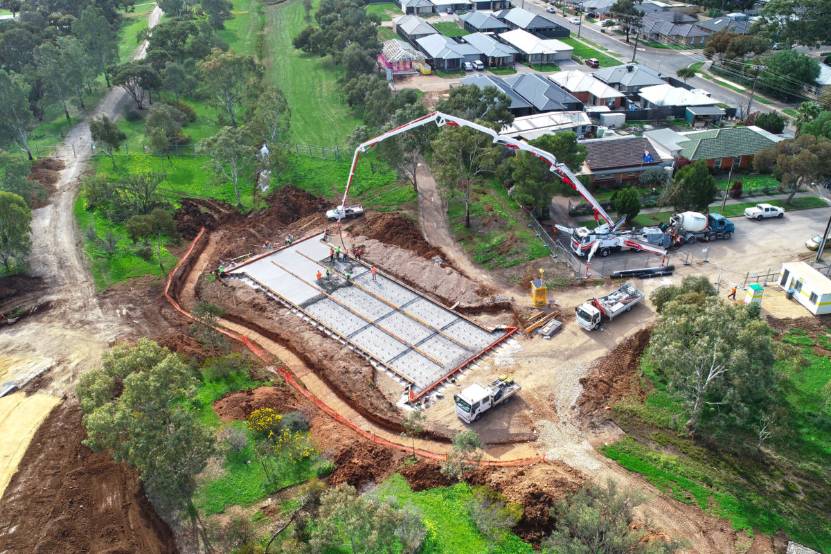 The upgrade of the existing Ladywood Road Bridge sought to reinforce the existing structure whilst adding significant flood capacity to the Dry Creek flow path. Scope included the installation of a new twin cell 2100x2400RCBC, in-situ concrete base slab and wing walls beneath the existing road bridge whilst at all times remaining open to traffic. Works also included the installation of a DN1800 RCP overflow outlet pipe and suspended concrete slab above the existing outfall structure to cover a dangerous hazard to passing vehicles.