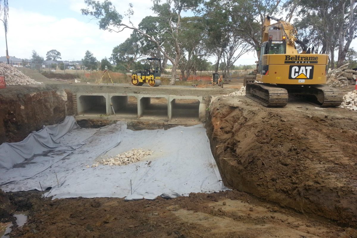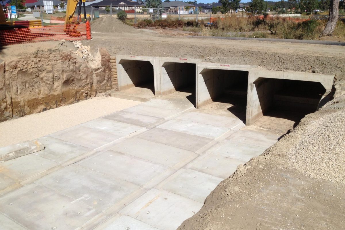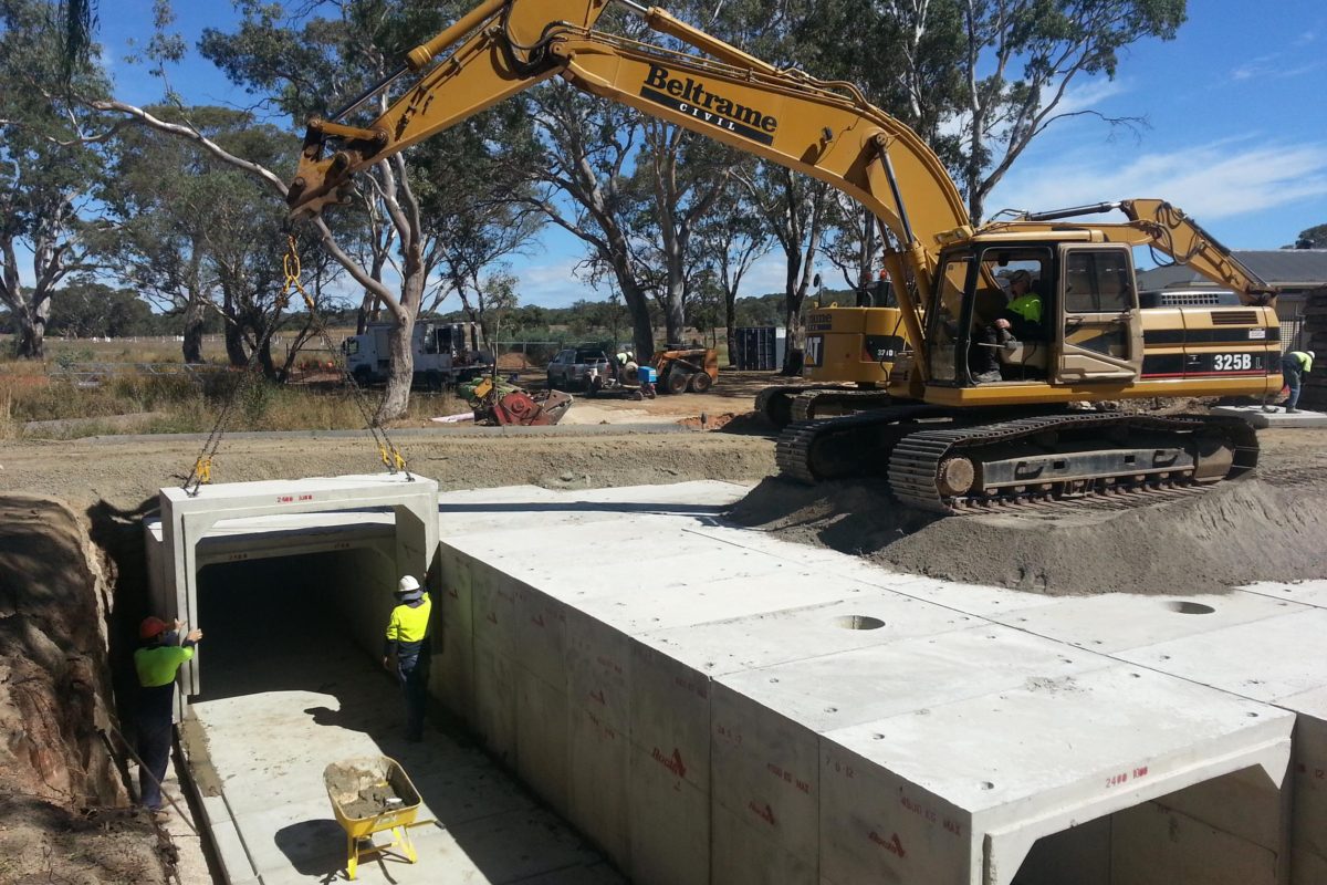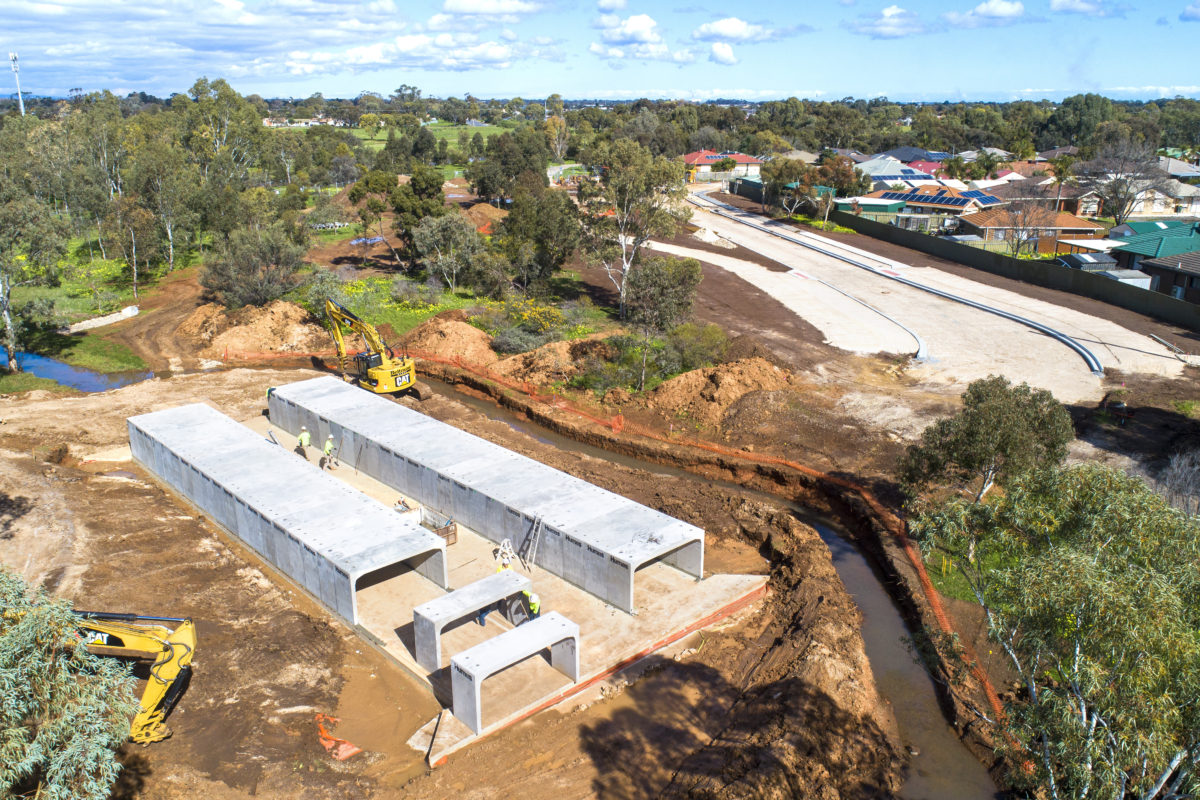 Beltrame Civil was engaged by the City of Playford to construct a large triple cell culvert crossing over Smith Creek to allow the linkup of the eastern and western sides ends Crittenden Road. The project was a key element of the Playford Alive master Plan and supported the vision for the overall area in providing a highly connected street pattern, giving motorists multiple route options and linkages between the suburbs of Smithfield Plains and Andrews Farms. The project scope included 3000m3 of cut to fill and import to fill; construction of 380m2 of in-situ culvert base slab; construction of a 30m long triple cell 3600x1800mm precast culvert bridge; construction of in-situ reinforced concrete head and wingwall; demolition of 900m2 of existing asphalt pavement; construction of 1800m2 of new deeplift asphalt pavement; construction of 500m of concrete kerb and gutter, including aprons, kerb ramps and driveways; and upgrading of Smith Creek including significant reshaping, batters incorporating matting for erosion control, extensive gabion walling and reno mattresses, rock lining and tree planting.