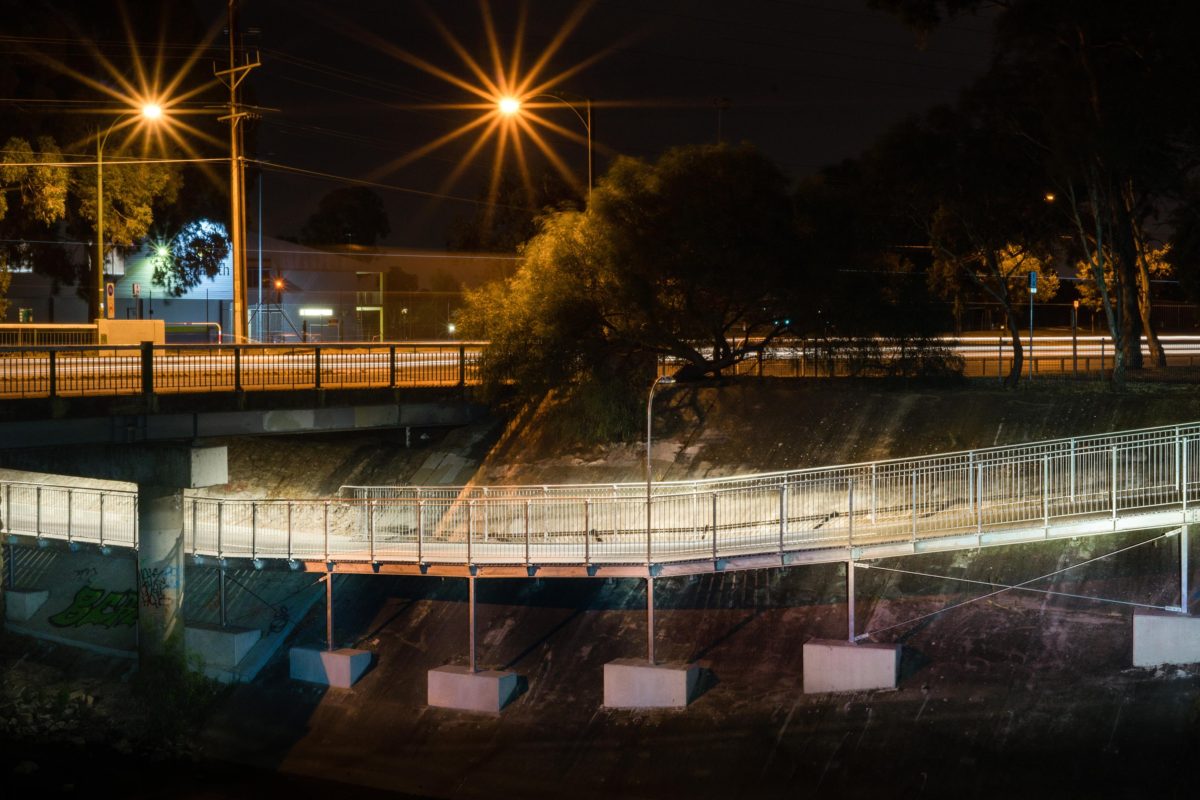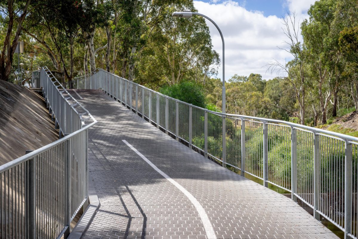 A lump sum design and construct contract to replace an existing timber structure which had fallen into a poor condition with a compliant shared use structure. The scope involved the full design management from concept to construction for a 60m long; 3m wide steel and recycled plastic shared use suspended underpass structure beneath Holbrooks Rd Underdale. Beltrame Civil developed a shot-crete mass footing design for the structure which removed the need for costly 14m deep piles. The structure designed for 1:100 year flood loads and a 100 year life had to weave its way down and through a very tight construction envelope. Additionally new approach paths, retaining walls and lighting were installed to complement the structure.